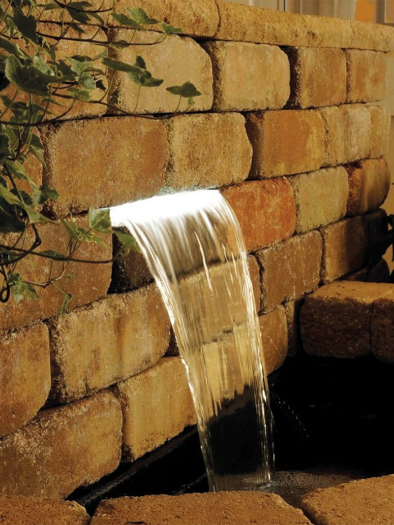 Łatwa w instalacji wylewka do strumieni i wodospadów z oświetleniem LED. Podświetlana krawędź wylewki z 24 ciepłymi białymi diodami LED. W tym schodkowy koniec węża (19/25 mm) do montażu z tyłu lub na dole.