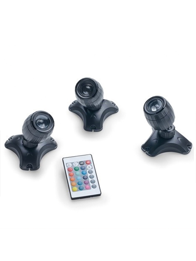 Zestaw trzech energooszczędnych lampek LED z możliwością wyboru koloru światła do stawów ogrodowych i innych zbiorników zewnętrznych.